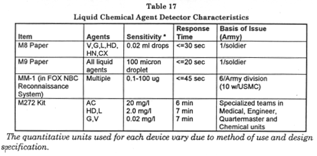 The most widely available detectors are treated papers (M8 and M9) that are sensitive to droplets of liquid chemical agents. These papers were distributed to individual level, and are worn attached to clothing or equipment (M9), or are used to investigate surfaces suspected of being contaminated (M8). These papers are intended only to provide indication of the presence of a liquid chemical agent hazard, either after receiving a suspected chemical attack, or when entering an area of suspected contamination. They are inexpensive and effective for an individual to determine if there is a liquid chemical agent hazard present, but they are not highly specific for chemical agents. They can respond to other organic substances, such as brake fluid. Users are trained to avoid placing the paper in contact with other substances known to cause false readings, and to consider other possible indicators of chemical agent presence when assessing a positive reaction of the paper.