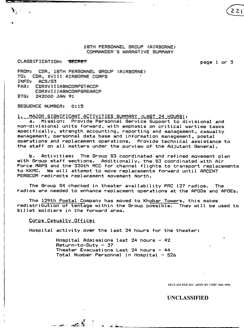Document 3 f:/Week-08/BX000015/DUTY LOG 18 PER GP SITREPS G3 JAN 91/major significant activities summary 242000 jan 91:04109619191914