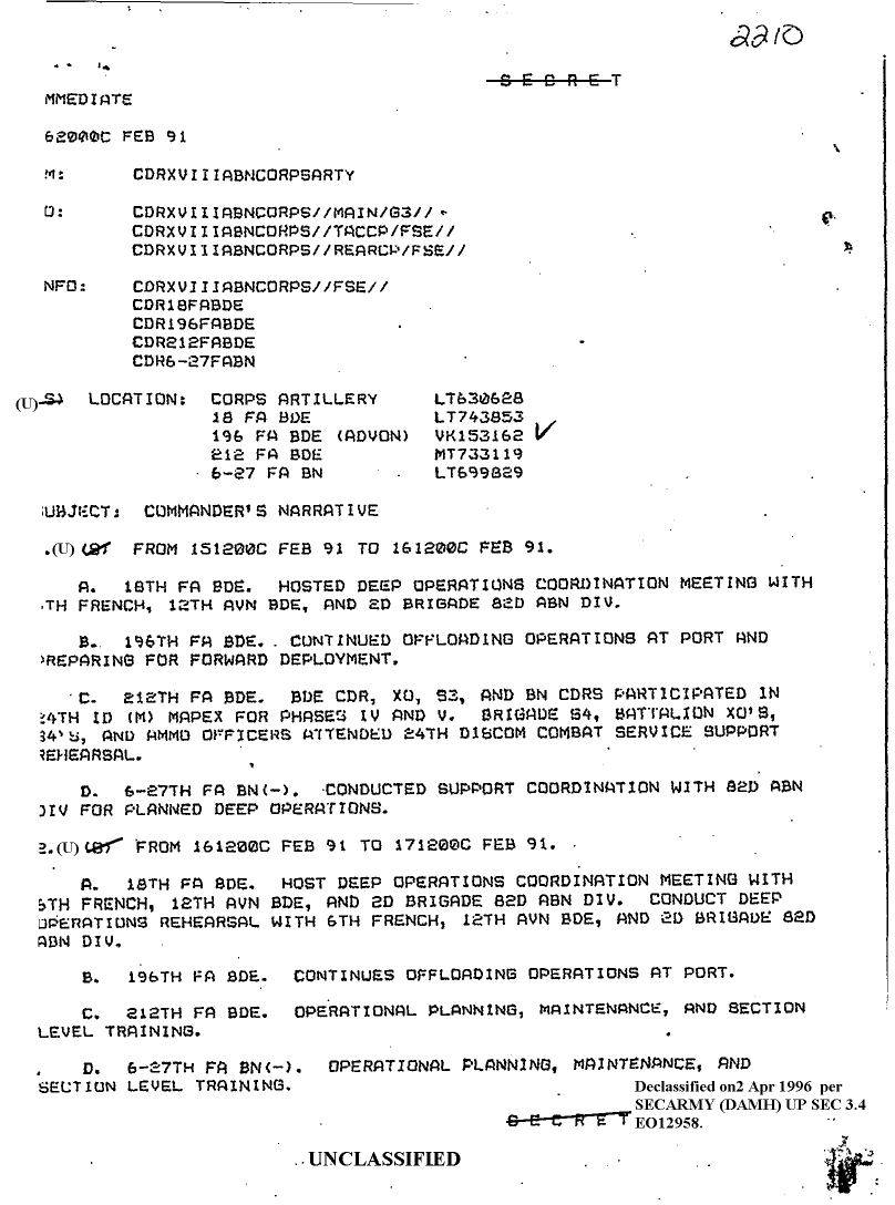 Folder Title = DUTY LOG 18 CORPS ARTY SITREPS G3 FEB 91