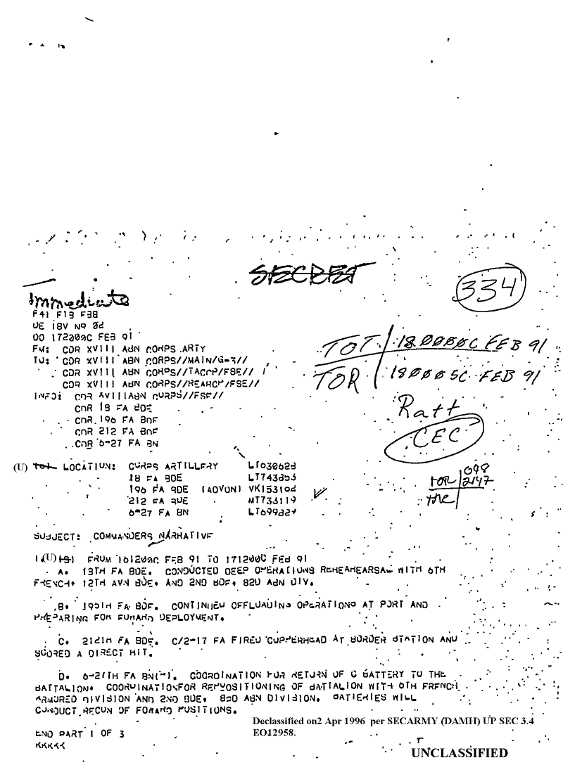 Folder Title = DUTY LOG 18 CORPS ARTY SITREPS G3 FEB 91