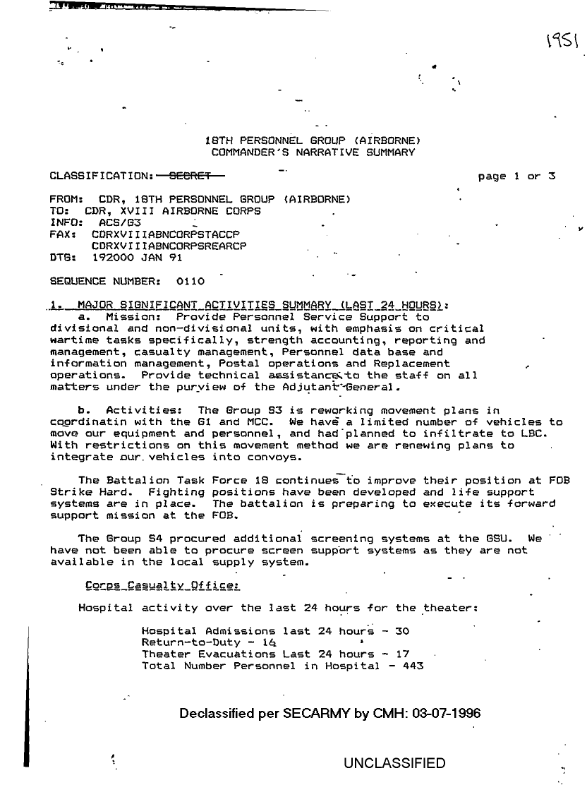 Document 3 f:/Week-08/BX000015/DUTY LOG 18 PER GP SITREPS G3 JAN 91/major significant activities summary 192000 jan 91:0410961919199