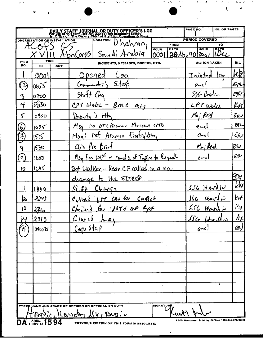 Subject = DAILY STAFF JOURNAL OR DUTY OFFICERS LOG 30 NOV TO 1 DEC 90
