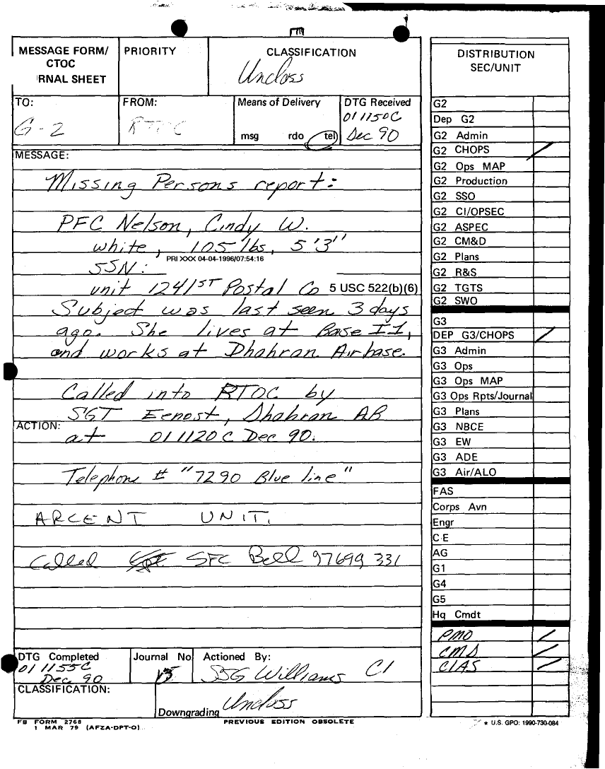 Document 46 f:/Week-12/BX000030/DUTY LOG MAIN CP G3 1 DEC 90/daily staff journal or duty officers log:04179616012091