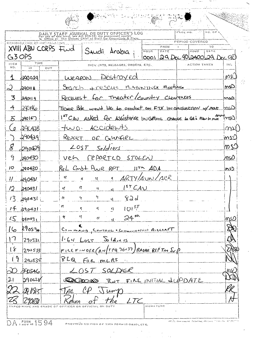 Document 12 f:/Week-16/BX000053/DUTY LOG G3 MAIN CP 29 DEC 90/daily staff journal or duty officers log:05309618571745