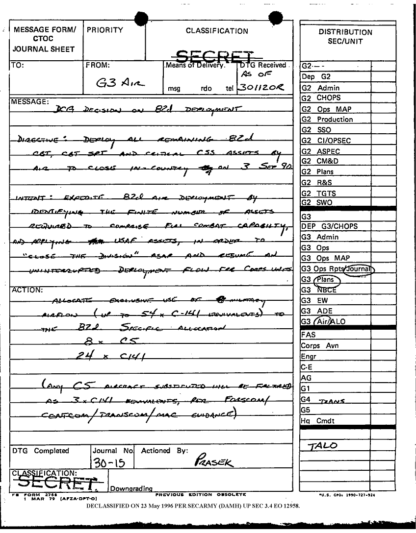 Subject = DAILY STAFF JOURNAL OR DUTY LOG XVIII ABN AUG 90