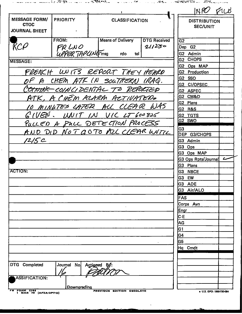 Document 1 f:/Week-09/BX000019/DUTY LOG G3 REAR 22 JAN 91/french units report chemical attack:0614961514428