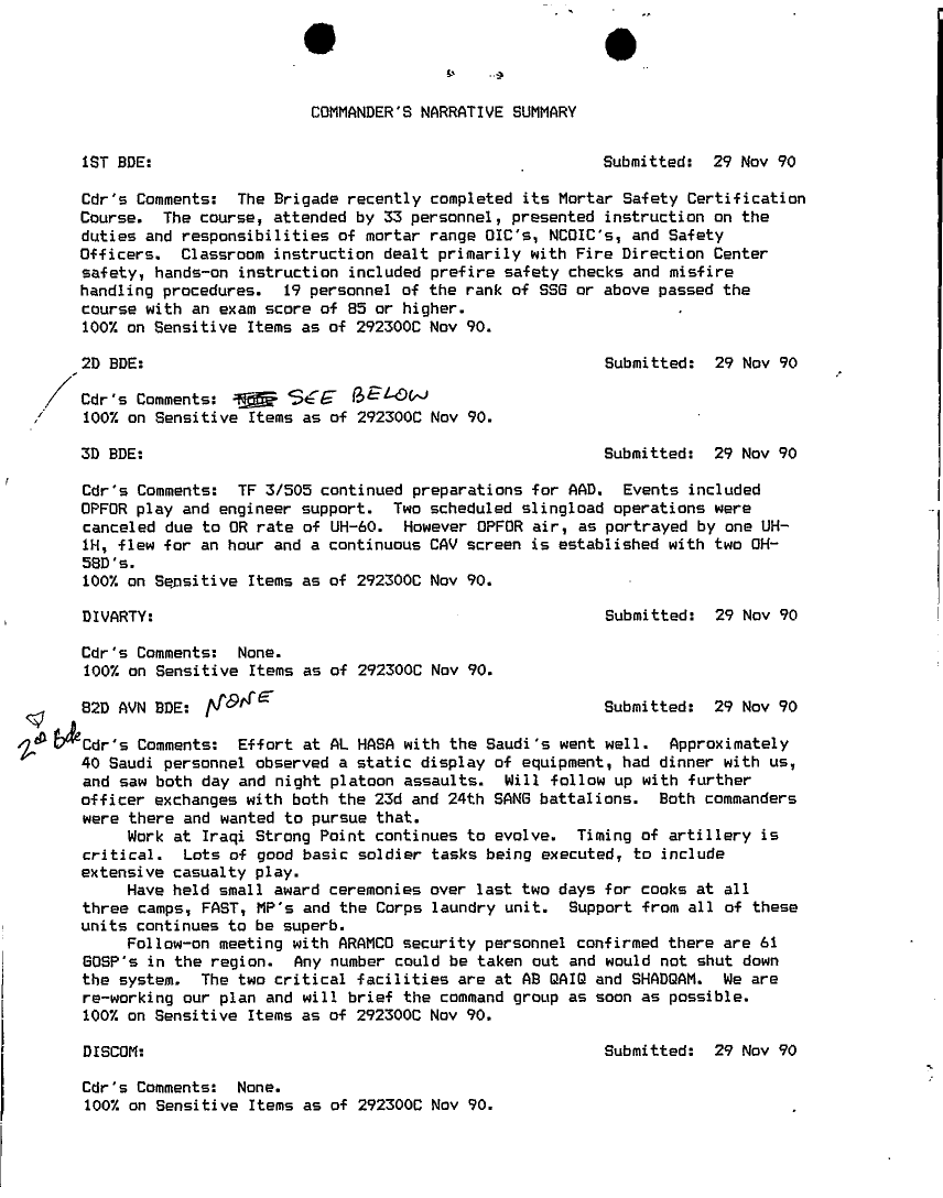 Subject = COMMANDERS NARRATIVE SUMMARIES NOV 90