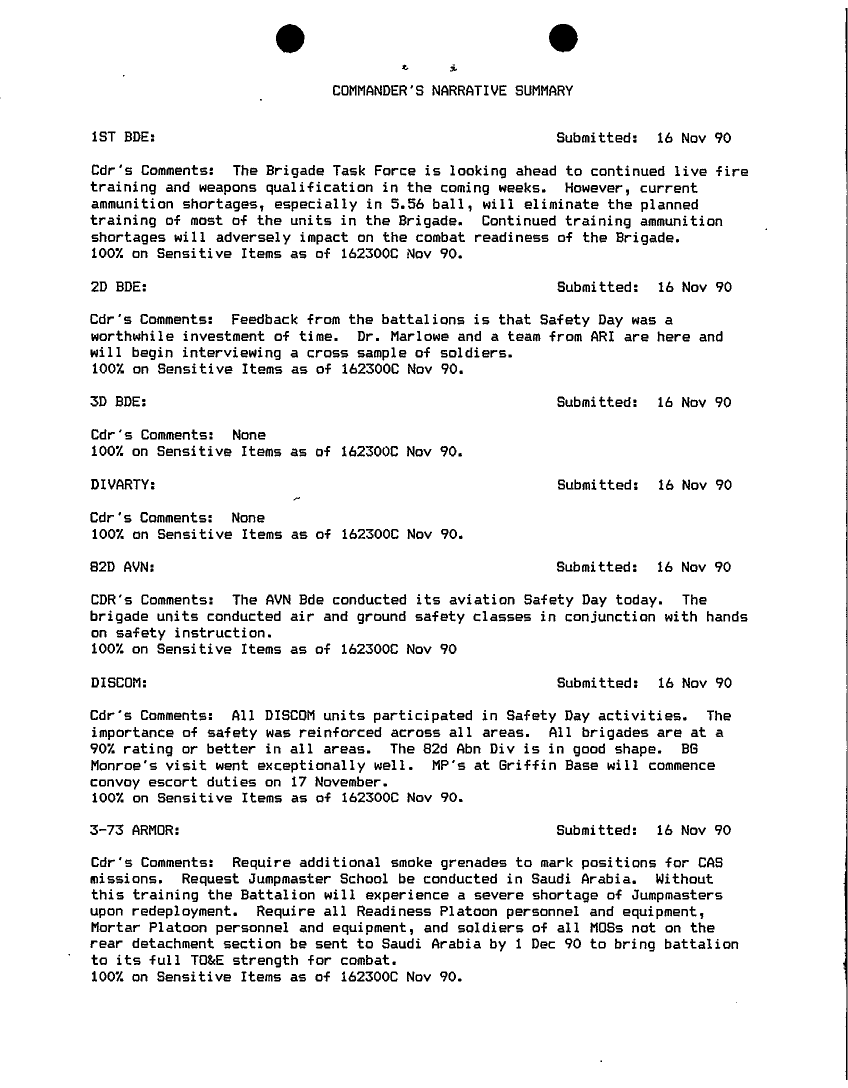 Subject = COMMANDERS NARRATIVE SUMMARIES NOV 90