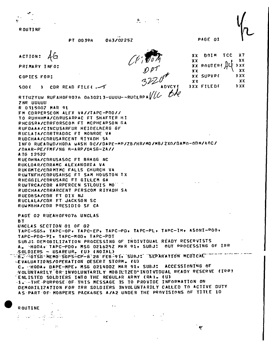 Subject = DEMOBILIZATION PROCESSING OF INDIV READY RESERVISTS 3MAR91