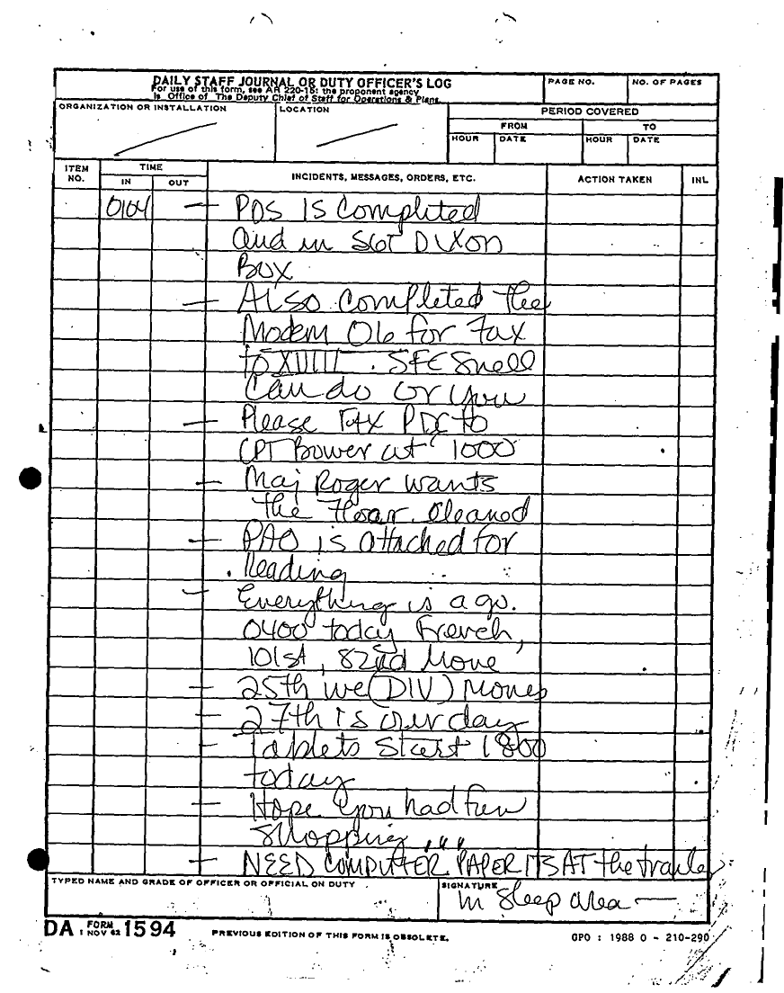Document 135 f:/Week-22/BX001433/MESSAGE-TELEPHONE TRAFFIC/daily staff journal or duty officers log:06219615521613