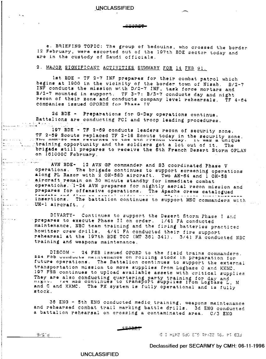 Document 3 f:/Week-22/BX001427/MISC UNIT STATUS SPOT REPORTS 14 FEB 91/commanders daily sitrep:07059613422122