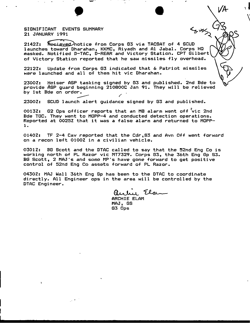 Document 1 f:/Week-20/BX001414/DUTY LOG 21 JAN 91 G3/significant events summary 21 jan 91:0705961342074