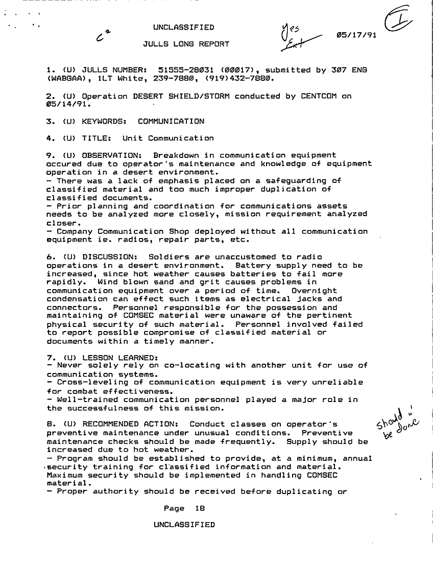 Document 38 f:/Week-22/BX001511/JULLS LONG REPORT 17 MAY 91 - 1/memorandum julls long report 17 may 91:07199610184621