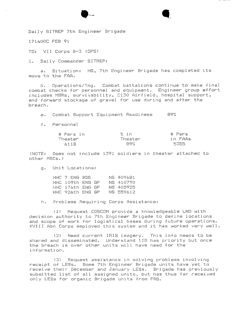 Document 35 f:/Week-24/BX000213/SITUATION REPORTS 7TH ENG BDE 22 DEC 90- 10 APR 91/daily commander sitrep:07269614225918