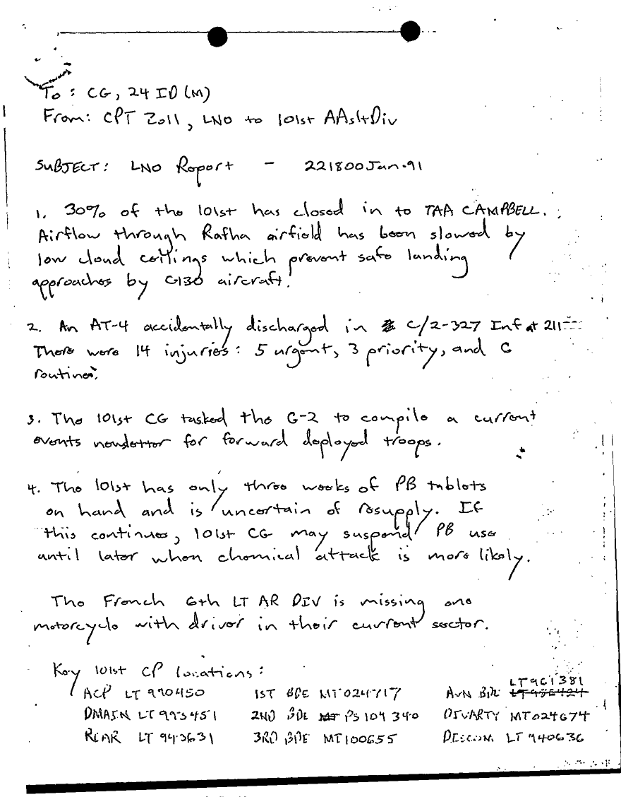 Document 2 f:/Week-20/BX001414/DUTY LOG 23 JAN 91 G3/lno report 22 jan 91:07269614230936