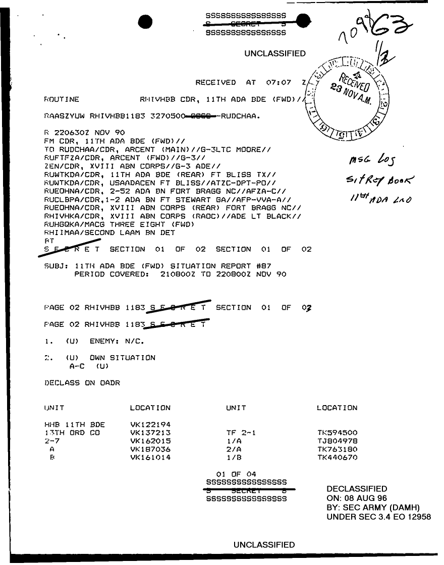 Document 11 f:/Week-29/BX000429/TACTICAL OPERATIONS CENTER LOGS - MSG FILE LOGS 23 NOV 90/11th ada bde situation report 87:08169613342730