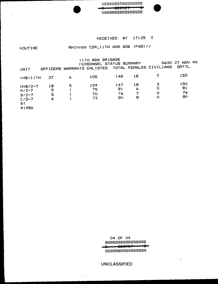 Document 9 f:/Week-29/BX000429/TACTICAL OPERATIONS CENTER LOGS - MSG FILE LOGS 28 NOV 90/11th ada bde situation report 94:08169613342831
