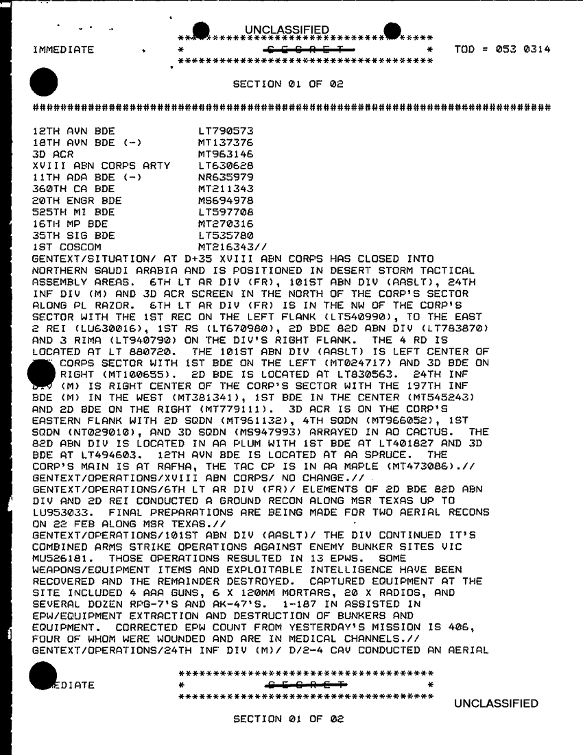 Document 6 f:/Week-29/BX000412/TACTICAL OPERATIONS CENTER LOGS - LUCKY TAC JOURNALS 22-23 FEB 91-1/sitrep xviii abn corps 021 feb 91:08239614361332