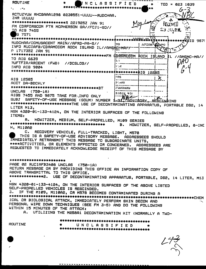 Document 2 f:/Week-29/BX000430/TACTICAL OP CTR LOGS - MSG FILE LOG 25-27 JAN 91/safety of use message:0823961435378