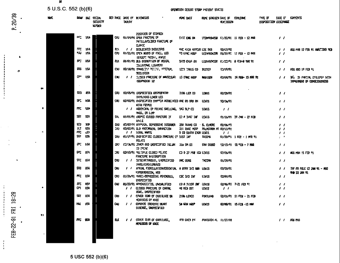 Document 38 f:/Week-31/BX000460/MEDSTAT-SITREPS - FEBRUARY - 2/ods patient status report 22feb91:09139616121511