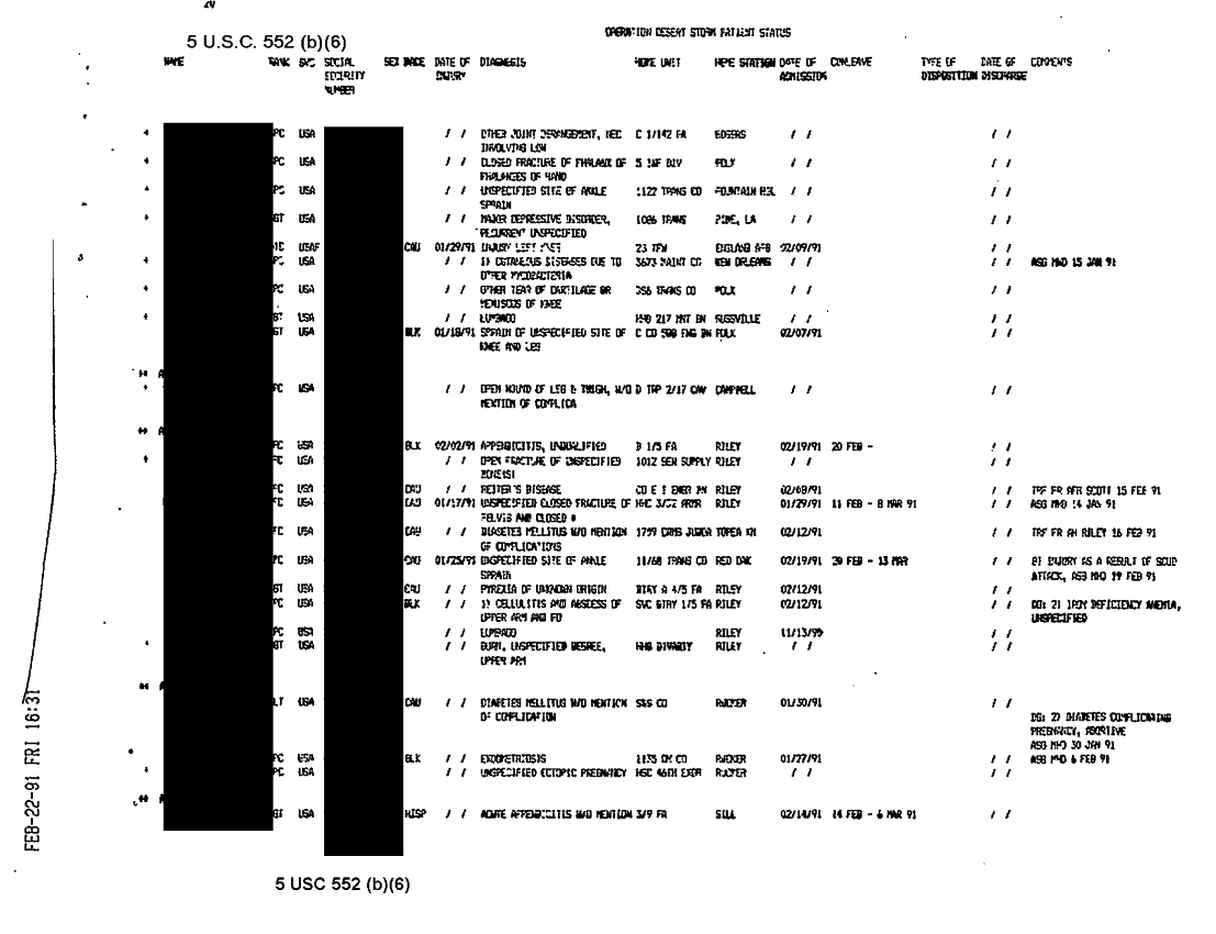 Document 38 f:/Week-31/BX000460/MEDSTAT-SITREPS - FEBRUARY - 2/ods patient status report 22feb91:09139616121511
