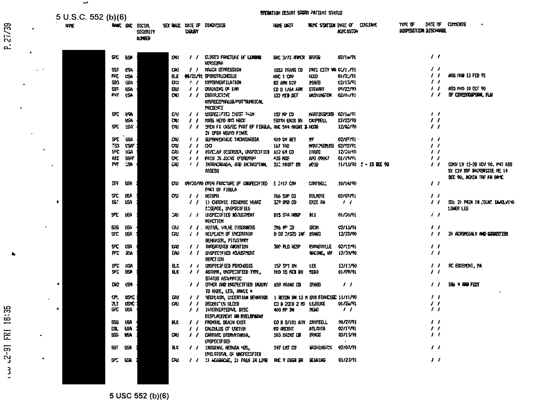 Document 38 f:/Week-31/BX000460/MEDSTAT-SITREPS - FEBRUARY - 2/ods patient status report 22feb91:09139616121511