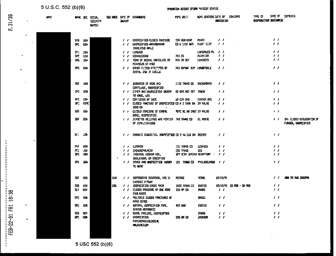 Document 38 f:/Week-31/BX000460/MEDSTAT-SITREPS - FEBRUARY - 2/ods patient status report 22feb91:09139616121511