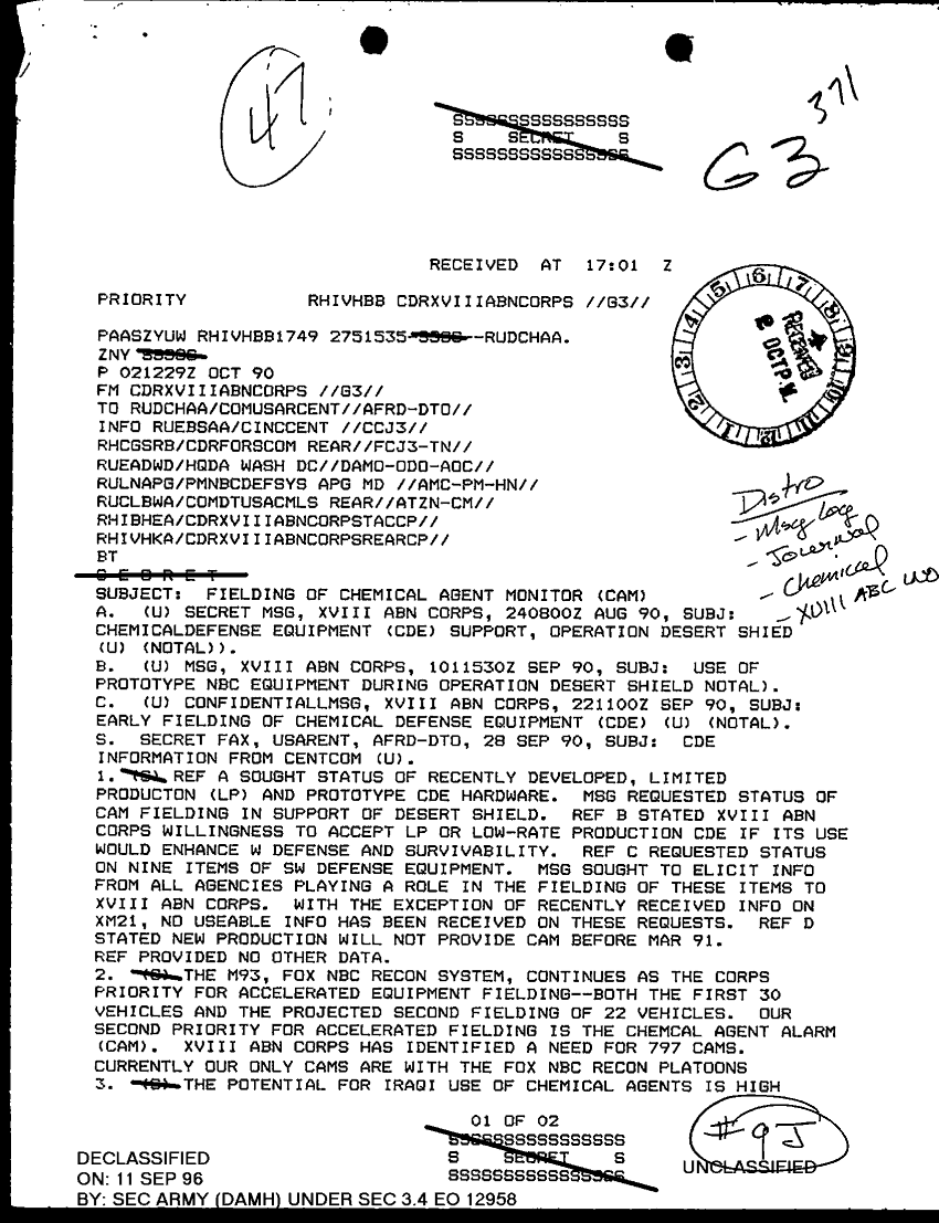 Document 2 f:/Week-29/BX000423/TACTICAL OPERATIONS CENTER LOGS - ARCENT MSG LOGS 2 OCT 90/fielding of chemical agent monitor 2 oct 90:09139616150687