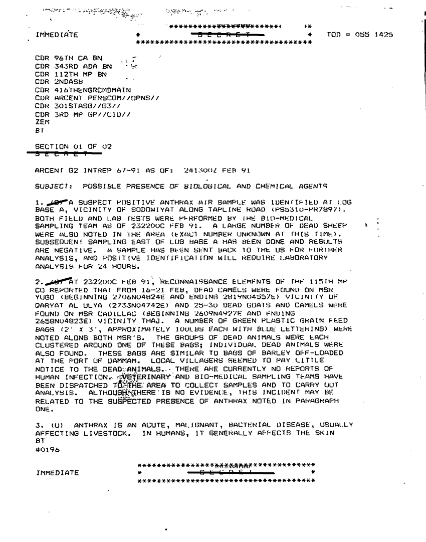 Document 7 f:/Week-32/BX000502/TACTICAL OPERATIONS CENTER LOGS-INCOMING MESSAGE FILES- 24 TO 26 FEB 91/possible presence of biological and chemical age:0906961405321
