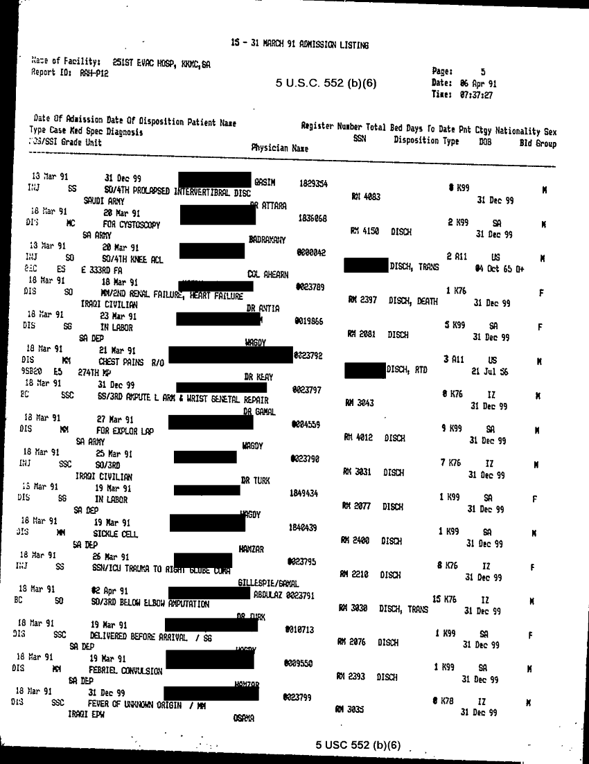 Document 28 f:/Week-32/BX000483/MEDSTAT - SITREPS APR 91 -3/patient adimission listing 15 31 mar 91:09069615155346