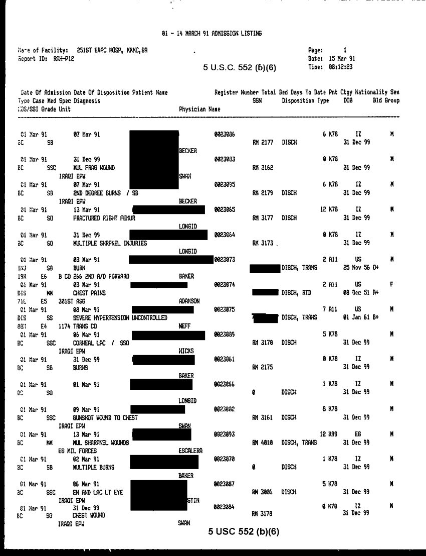 Document 30 f:/Week-32/BX000483/MEDSTAT - SITREPS APR 91 -3/patient admission listing 15 mar 91:092096155910117