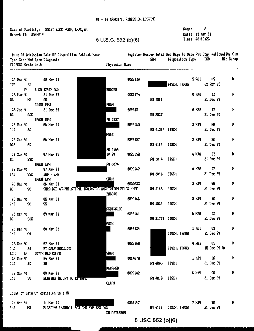 Document 30 f:/Week-32/BX000483/MEDSTAT - SITREPS APR 91 -3/patient admission listing 15 mar 91:092096155910117