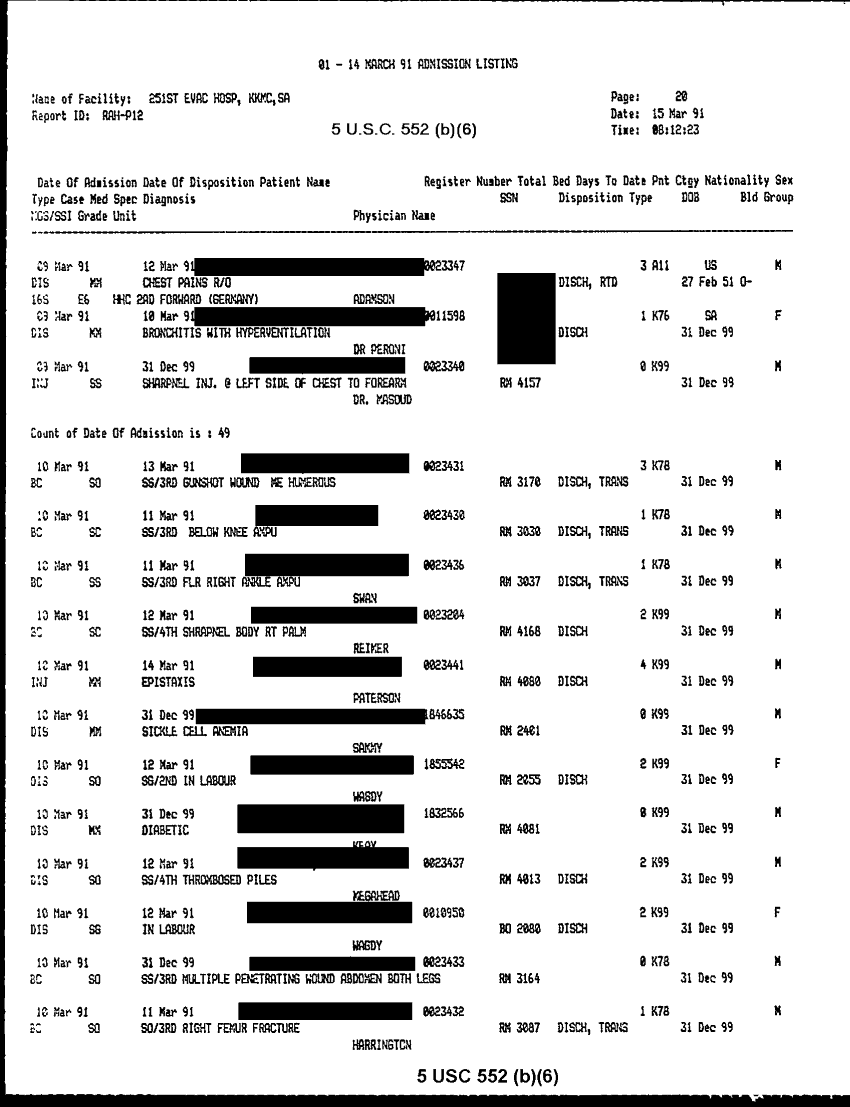 Document 30 f:/Week-32/BX000483/MEDSTAT - SITREPS APR 91 -3/patient admission listing 15 mar 91:092096155910117