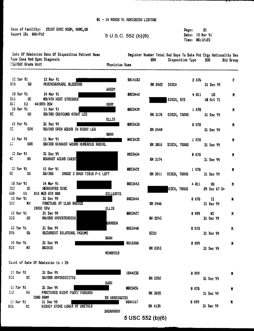 Document 30 f:/Week-32/BX000483/MEDSTAT - SITREPS APR 91 -3/patient admission listing 15 mar 91:092096155910117
