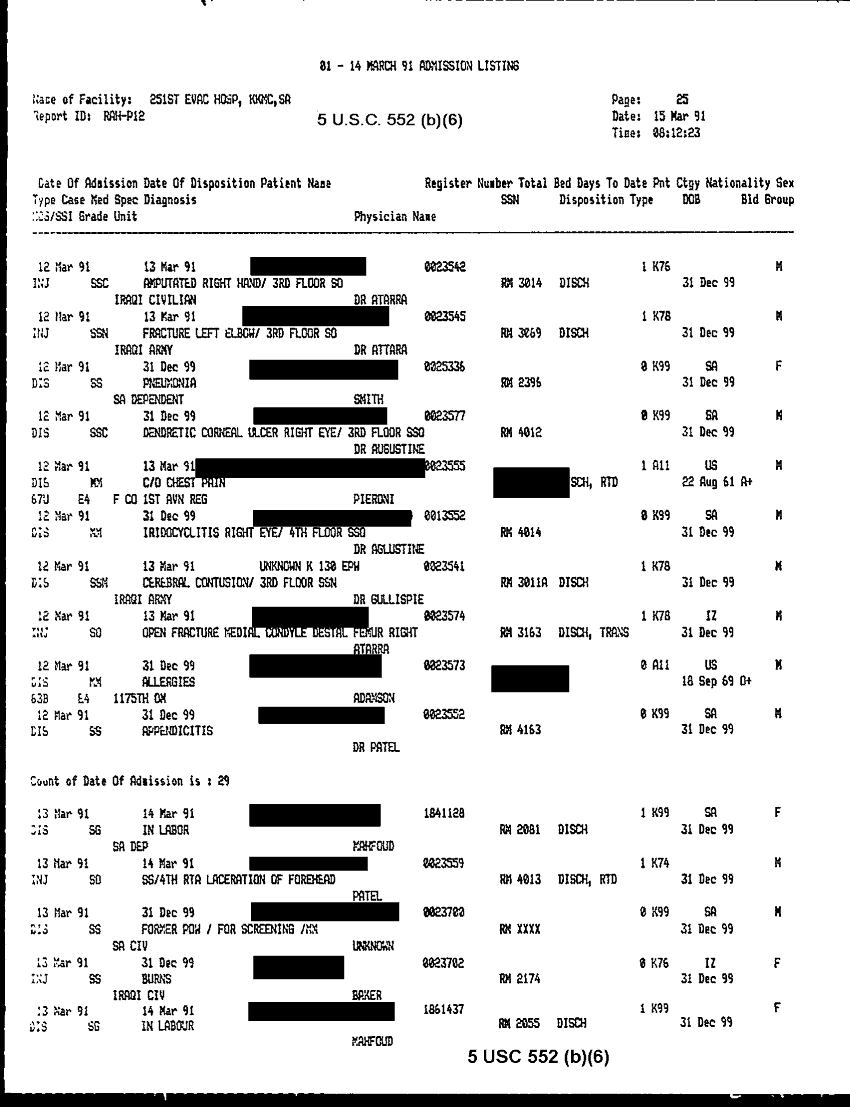 Document 30 f:/Week-32/BX000483/MEDSTAT - SITREPS APR 91 -3/patient admission listing 15 mar 91:092096155910117