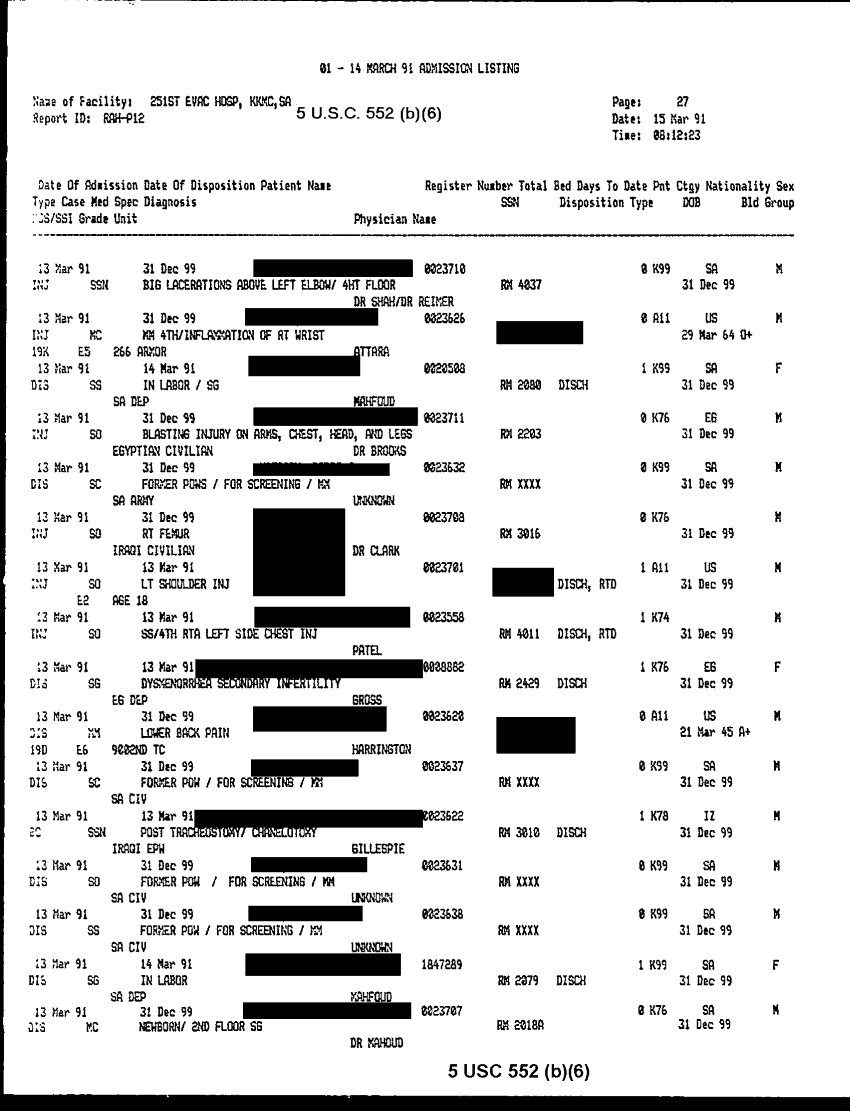 Document 30 f:/Week-32/BX000483/MEDSTAT - SITREPS APR 91 -3/patient admission listing 15 mar 91:092096155910117