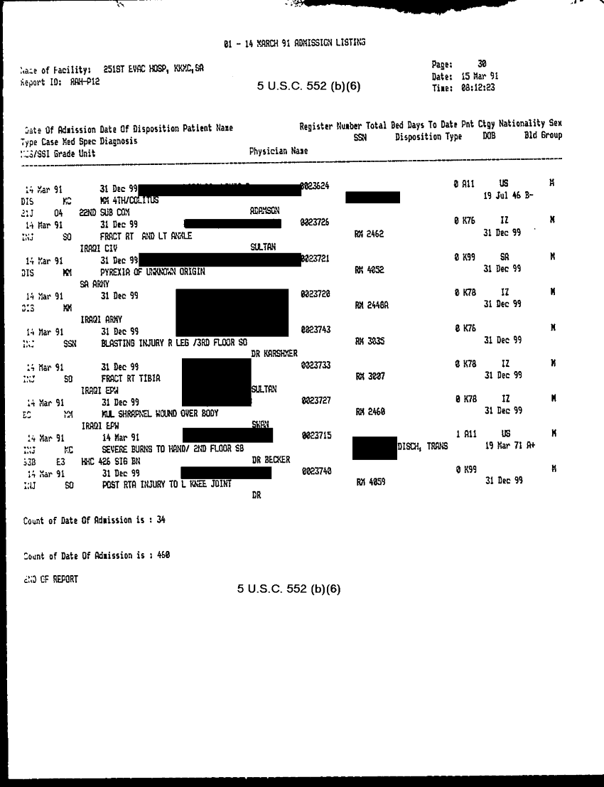 Document 30 f:/Week-32/BX000483/MEDSTAT - SITREPS APR 91 -3/patient admission listing 15 mar 91:092096155910117
