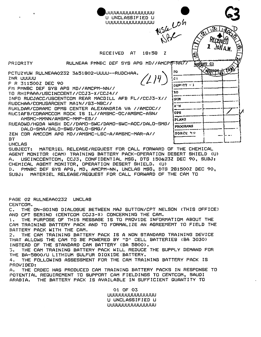 Document 3 f:/Week-29/BX000430/TACTICAL OP CTR LOGS - MSG FILE LOG 1-2 JAN 91/material release req for call fwd of chemical ag:09209615581323