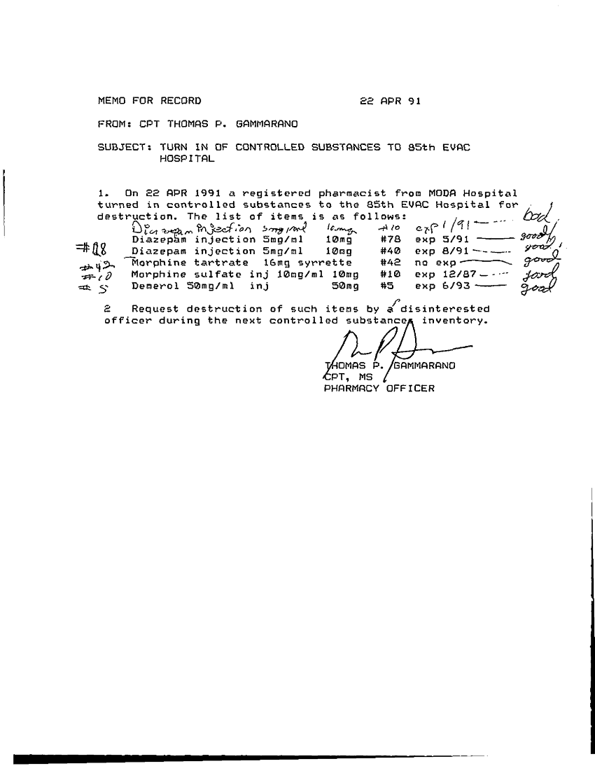 Subject = TURN IN OF CONTROLLED SUBSTANCES TO 85TH EVAC HO