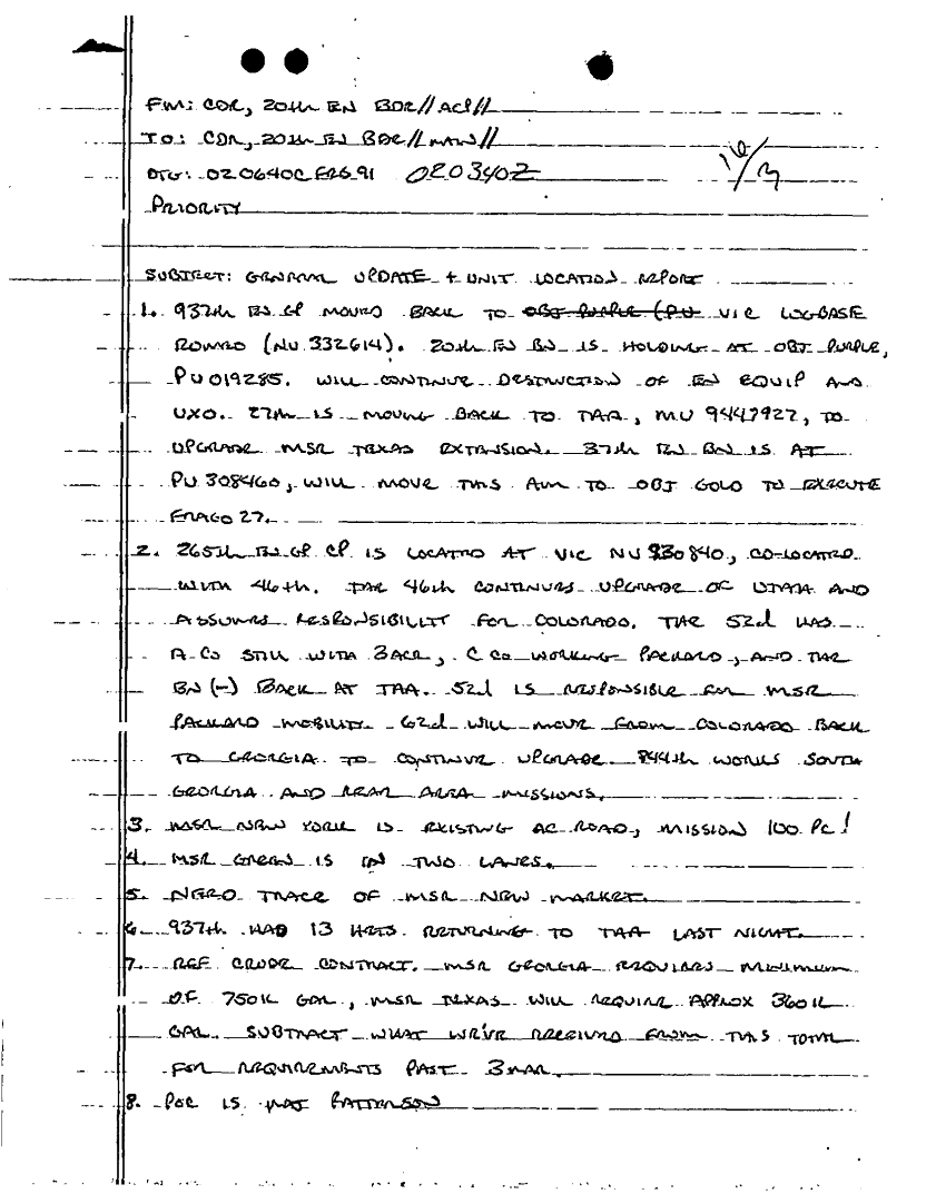 Document 3 f:/Week-18/BX000057/DUTY LOG MAIN CP MESSAGES 20 ENGINEER BDE 2 MAR 91/general update unit location report:101196154315159