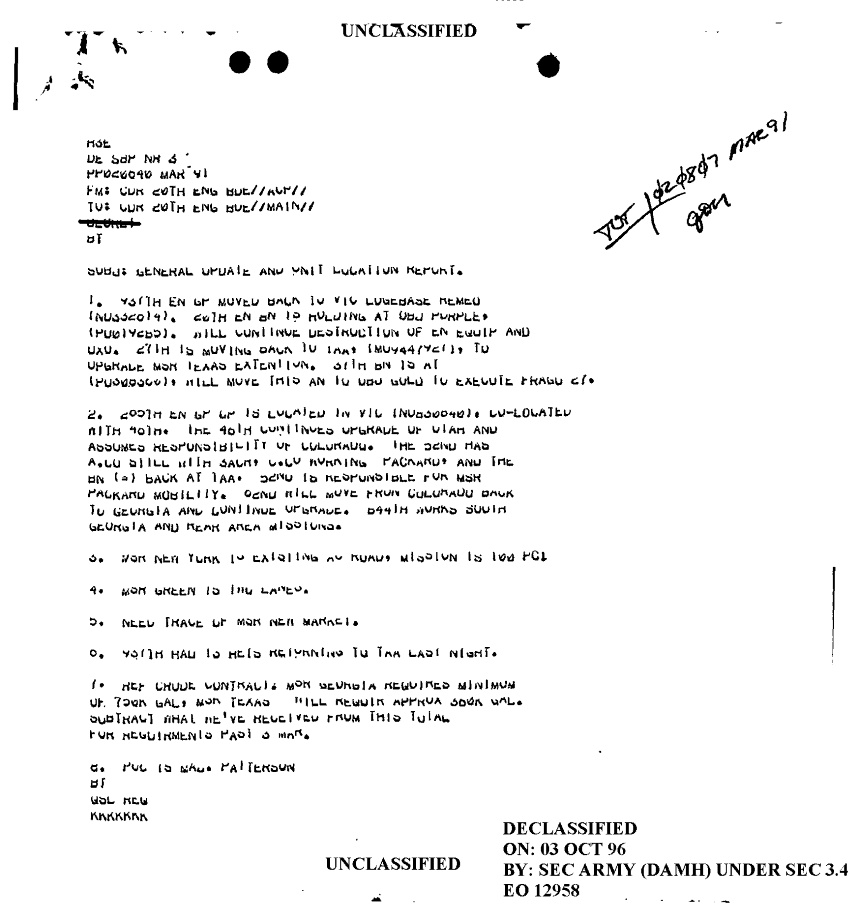 Document 3 f:/Week-18/BX000057/DUTY LOG MAIN CP MESSAGES 20 ENGINEER BDE 2 MAR 91/general update unit location report:101196154315159