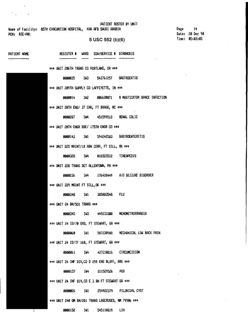 Document 30 f:/Week-32/BX000482/MEDSTAT - SITREPS DEC 90 2 OF 6/patient roster by unit 85th evac hospital 20 d:10119615412450