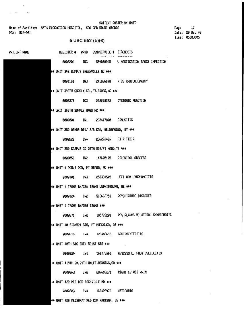 Document 30 f:/Week-32/BX000482/MEDSTAT - SITREPS DEC 90 2 OF 6/patient roster by unit 85th evac hospital 20 d:10119615412450