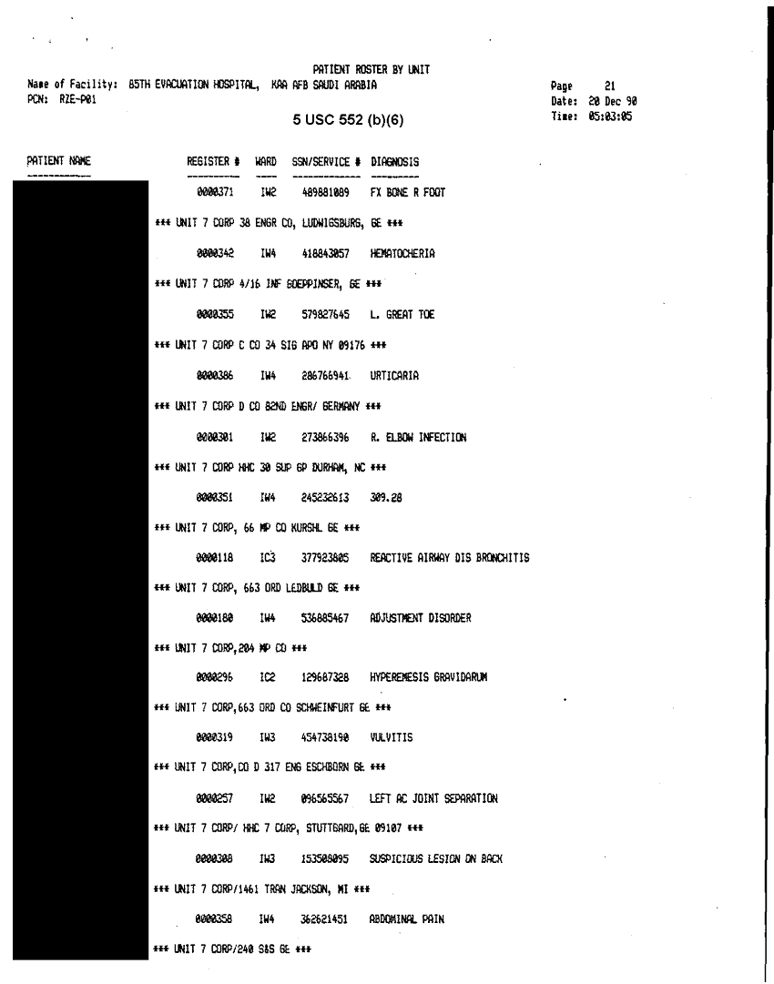 Document 30 f:/Week-32/BX000482/MEDSTAT - SITREPS DEC 90 2 OF 6/patient roster by unit 85th evac hospital 20 d:10119615412450