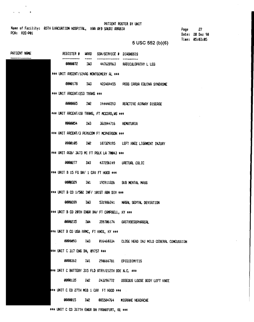 Document 30 f:/Week-32/BX000482/MEDSTAT - SITREPS DEC 90 2 OF 6/patient roster by unit 85th evac hospital 20 d:10119615412450