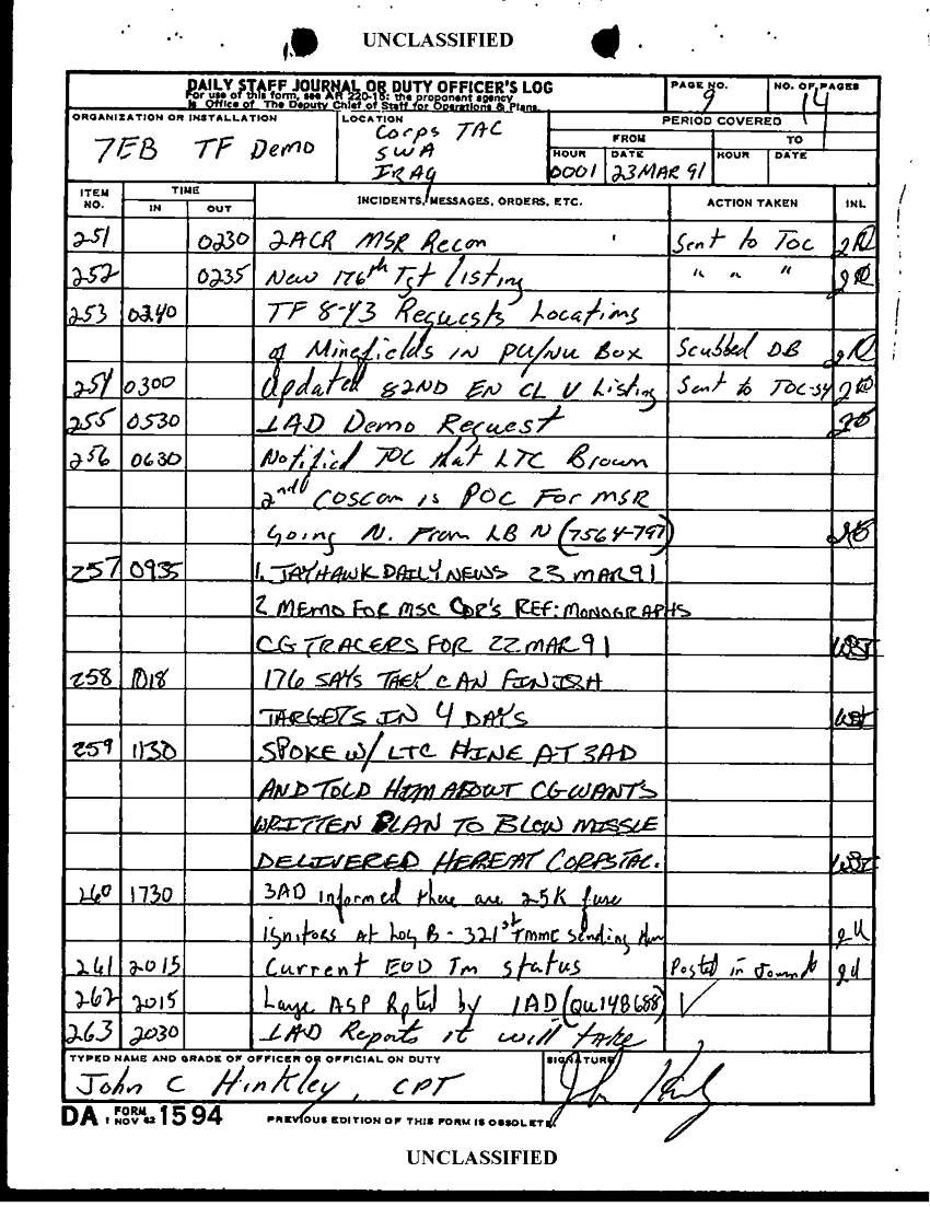 Document 14 f:/Week-24/BX000211/TASK FORCE DEMO LOG 14 MAR- 1 APR 91/daily staff journal or duty officers log:10119615421190