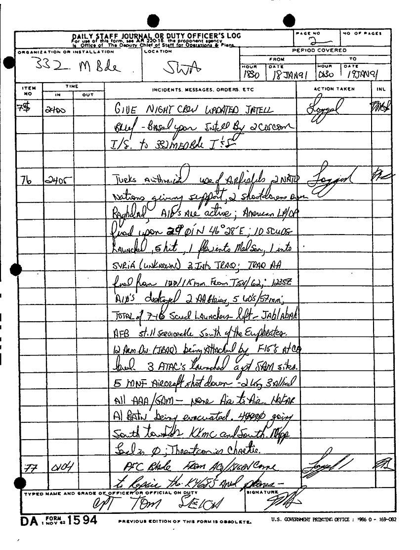 Document 34 f:/Week-34/BX005159/DA FORM 1594-DAILY STAFF JOURNAL OR DUTY OFFICERS LOG -23 DEC 90-26 JAN 91/daily staff journal or duty officers log 21 jan :10019616505868