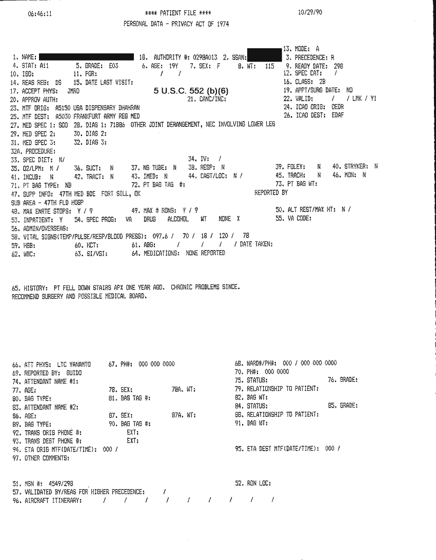 Document 46 f:/Week-32/BX000482/MEDSTAT - SITREPS OCT 90 3 OF 4/patient file 29 oct 90:10019616503417