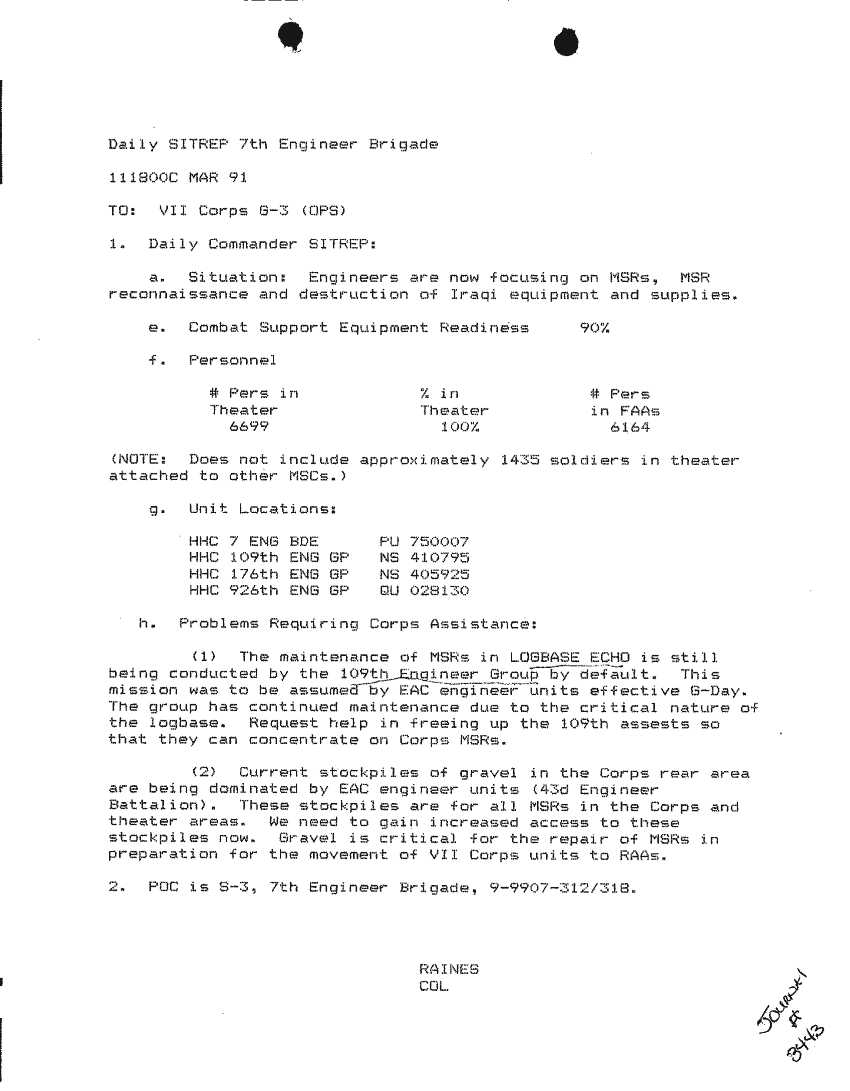 Document 87 f:/Week-24/BX000213/SITUATION REPORTS 7TH ENG BDE 22 DEC 90- 10 APR 91/daily commander sitrep:10019616504540