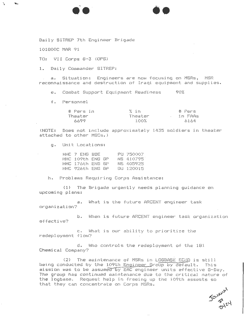 Document 87 f:/Week-24/BX000213/SITUATION REPORTS 7TH ENG BDE 22 DEC 90- 10 APR 91/daily commander sitrep:10019616504540